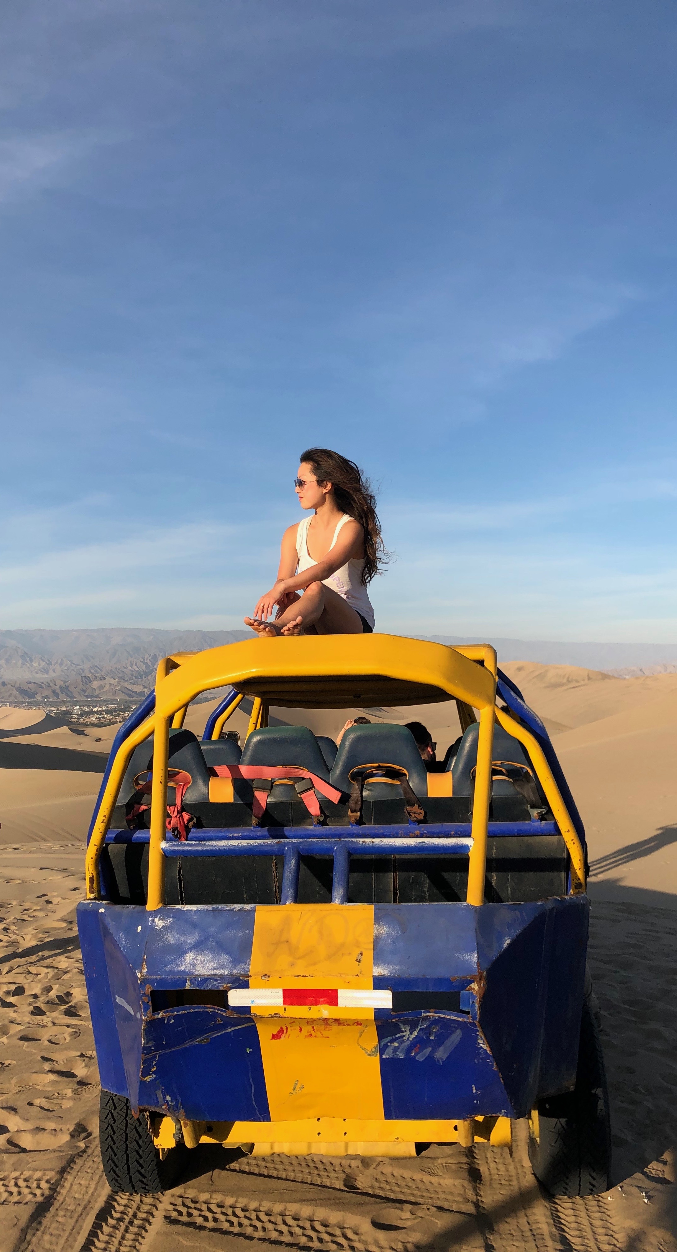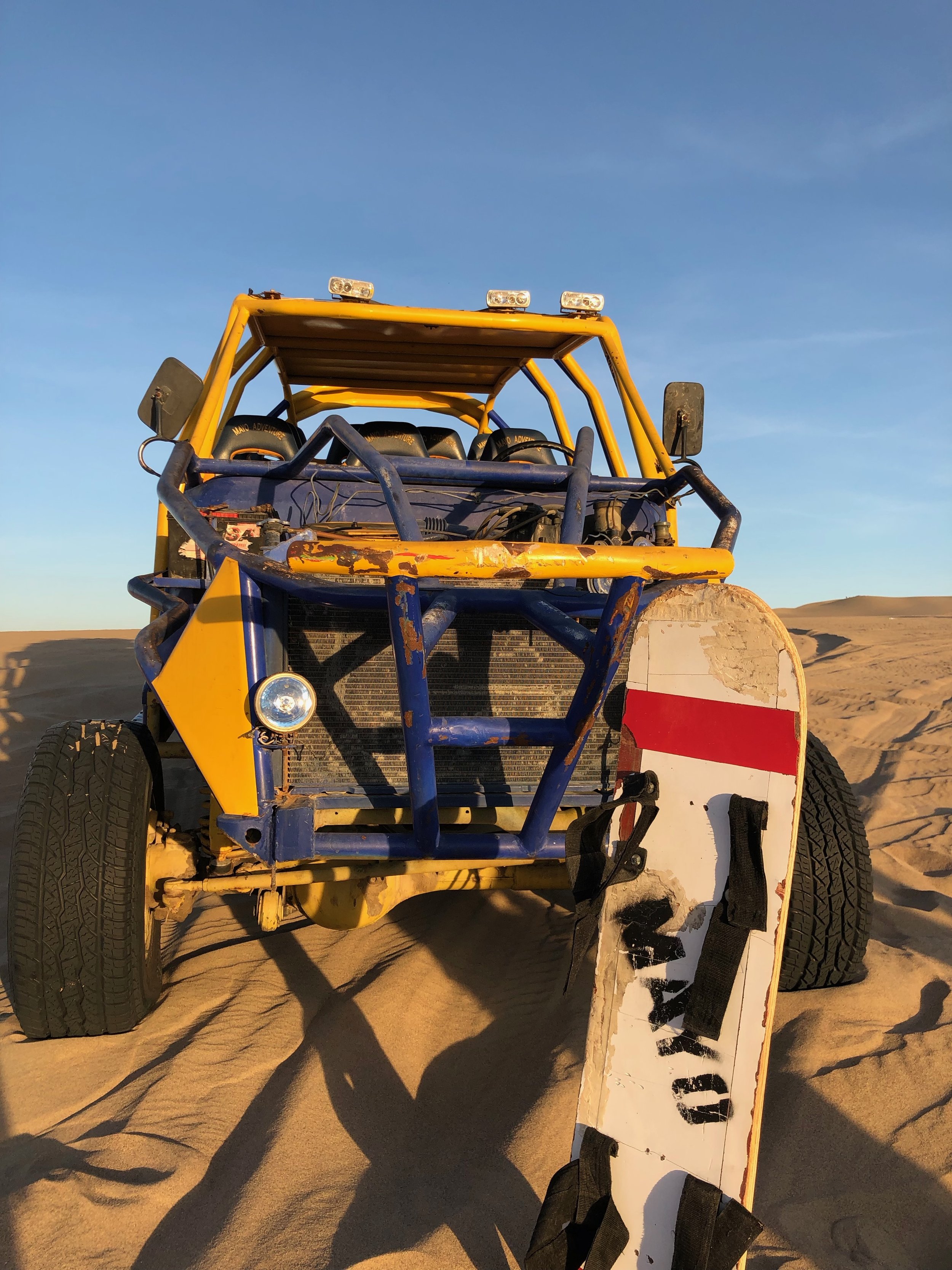 Huacachina is a popular tourist destination for sand sports; namely, dune buggying and sand boarding. The dune buggies have scheduled times throughout the day for these adventure tours and you can either book in advance or book in person. I suggest the latter because the companies tend to lower their prices as time gets closer to departure. We also went on the evening (4 p.m.) tour because the sun was less harsh, and we got the added bonus of watching the sunset on the dunes! 30-35 soles is the average price for the dune buggy and sand boarding combined tour. But if you waited like we did, we paid 19 soles per person. The dune buggies feature 3 rows of seats and carry 11 people total, including the driver. The two seats in the first row get the best view, but also the best taste of sand. You’ll literally be eating sand if your driver drove as crazy as ours did. The middle row is best for those who are prone to motion sickness and less inclined to eat sand. The last row feels all the buggy’s worn out suspension and shocks. It’s a rough ride. Pick your poison, friends! We, by default, got the last row.