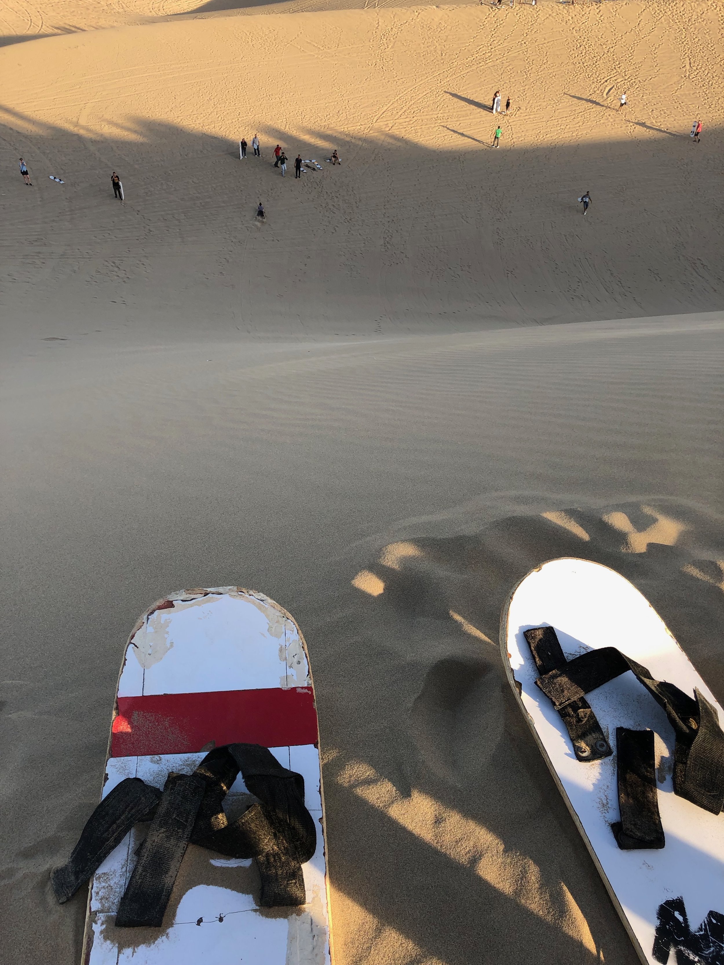 After settling in at the hostel, my sister and I walked along the ridge to the highest sand peak overlooking the small town. There are several ways up—and of course we took the longer (and naturally, less crowded) way. The most popular route starts on the west side of the lagoon by the dune buggies. It’s hard to miss. Just follow the over-beaten path, strewn with footprints. We started at the entrance to the town, where there was a large wooden cross protruding from the sand. We ascended along the ridge and after about 20 minutes, made it to the top. If you’ve seen those Instagram pictures of Huacachina, well voila, they’re taken here.