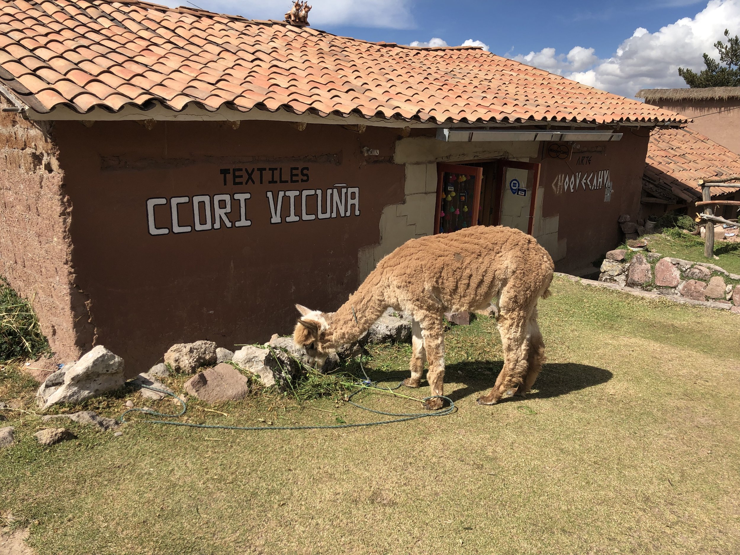 As we walked downhill to the next ruin, we walked past this small store, Textiles Ccori Vicuna, with alpacas and llamas out front. I stood at a distance taking photos of the alpacas until a man walked out from the store and motioned for me to get a closer shot. He encouraged me to pet the alpaca, but I was hesitant (because on numerous occasions, I was asked to pay a fee after petting/holding the animal). He told me it was absolutely free and so I reluctantly petted the baby alpaca…oh boy, it was so soft! As he motioned for us to come in to check out his store, I began thinking to myself “Great, another tourist trap…” but I followed him inside anyway. He served us some hot tea, and guided us to the center of his store where a table of fur, textiles, and coloring agents were neatly spread out. He started by explaining how to discern between real alpaca textile and what people claim is “real”. He pulled a small wad of thread from an alpaca scarf and lit a match underneath it. It immediately caught fire. He held it up and asked us to smell it. It smelled like burnt hair. I quickly pulled out an “alpaca sweater” I bought from a street vendor, and he immediately shook his head. “Mixto.” He pulled a wad of loose thread and lit it on fire. It caught fire, but didn’t smell like burnt hair. He pinched the burnt wad in between his fingers, then placed it into my palm. “Feel. It is hard like plastic. Mixto. Mostly synthetic material, mixed with a little alpaca.” Real 100% alpaca sweaters typically run in between 300-600 soles (approx. $100-200 USD). I bought my sweater for 35 soles, so go figure.